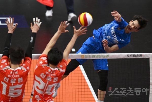 23일 안산상록수체육관에서 열린 ‘2022~2023 도드람 V-리그’ 남자부 OK금융그룹과 한국전력 경기에서 한국전력 임성진이 OK금융그룹의 블로킹 사이로 스파이크를 날리고 있다.