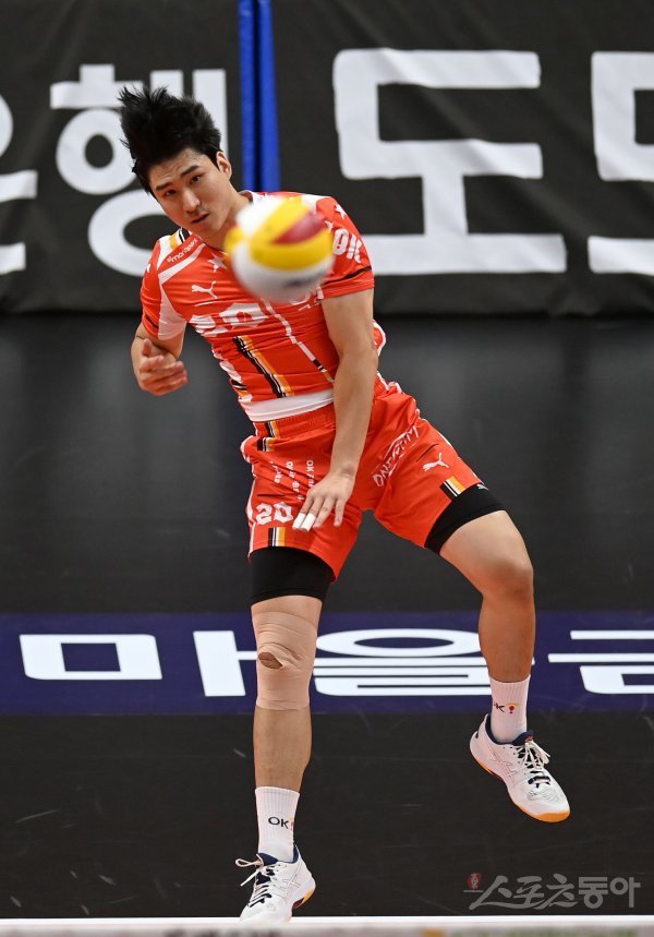 23일 안산상록수체육관에서 열린 ‘2022~2023 도드람 V-리그’ 남자부 OK금융그룹과 한국전력 경기에서 OK금융그룹 신호진이 서브를 하고 있다.