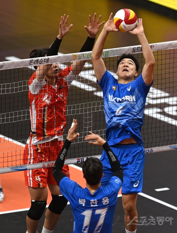23일 안산상록수체육관에서 열린 ‘2022~2023 도드람 V-리그’ 남자부 OK금융그룹과 한국전력 경기에서 한국전력 하승우가 토스를 하고 있다.