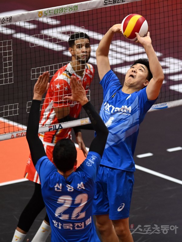 23일 안산상록수체육관에서 열린 ‘2022~2023 도드람 V-리그’ 남자부 OK금융그룹과 한국전력 경기에서 한국전력 하승우가 토스를 하고 있다.