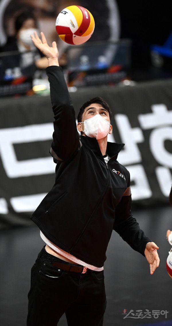 23일 안산상록수체육관에서 열린 ‘2022~2023 도드람 V-리그’ 남자부 OK금융그룹과 한국전력 경기 전 OK금융그룹 럭비단 안드레 진 코치가 시구를 하고 있다.
