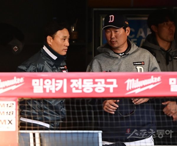23일 인천 SSG랜더스필드에서 열린 KBO리그 SSG 랜더스와 두산 베어스의 연습경기에서 9-7로 승리한 두산 이승엽 감독과 김한수 코치가 이야기를 하고 있다.