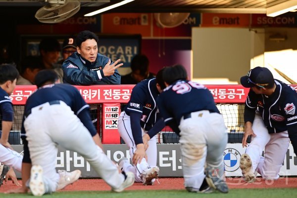 23일 인천 SSG랜더스필드에서 열린 KBO리그 SSG 랜더스와 두산 베어스의 연습경기에서 9-7로 승리한 훈 두산 이승엽 감독이 선수들과 이야기를 하고 있다.