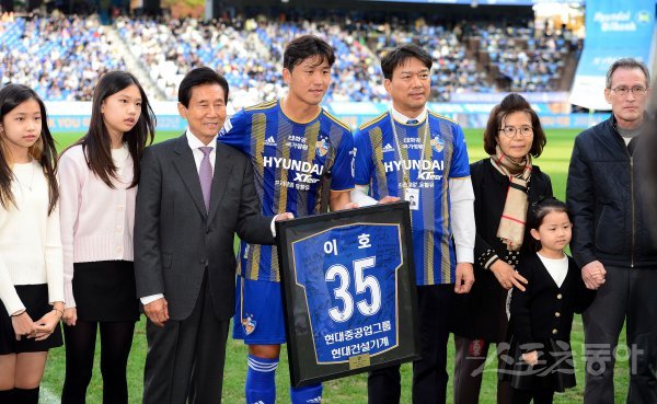 23일 울산 문수월드컵경기장에서 열린 ‘하나원큐 K리그1 2022’ 울산 현대와 제주 유나이티드의 경기에서 울산 이호가 은퇴식을 치르며 가족 및 구단 관계자와 기념촬영을 하고 있다. 울산 | 김민성 기자 marineboy@donga.com