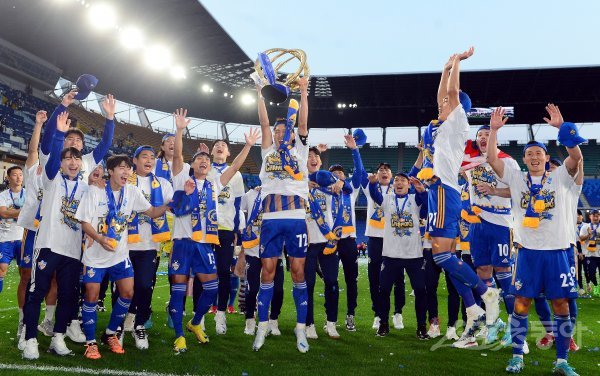 23일 울산 문수월드컵경기장에서 열린 ‘하나원큐 K리그1 2022’ 울산 현대와 제주 유나이티드의 경기 후 우승을 차지한 울산 선수들이 기쁨을 나누고 있다.