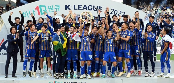 23일 울산 문수월드컵경기장에서 열린 ‘하나원큐 K리그1 2022’ 울산 현대와 제주 유나이티드의 경기 후 우승을 차지한 울산 홍명보 감독 및 선수들이 우승 트로피를 들고 환호하고 있다.