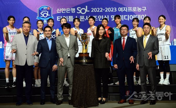 24일 서울 여의도 63컨벤션센터에서 열린 ‘신한은행 SOL 2022-2022 여자프로농구’ 미디어데이에서 6개 구단 감독 및 선수들이 기념촬영을 하고 있다.