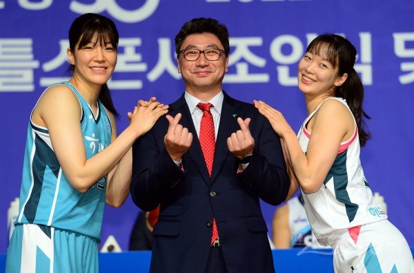 24일 서울 여의도 63컨벤션센터에서 열린 ‘신한은행 SOL 2022-2022 여자프로농구’ 미디어데이에서 하나원큐 양인영, 김도완 감독, 신지현이 포즈를 취하고 있다.