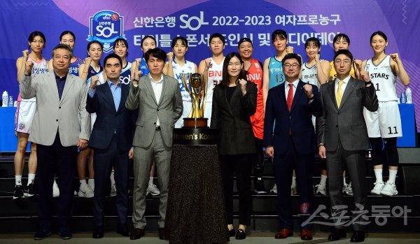 24일 서울 여의도 63컨벤션센터에서 열린 ‘신한은행 SOL 2022-2022 여자프로농구’ 미디어데이에서 6개 구단 감독 및 선수들이 기념촬영을 하고 있다.