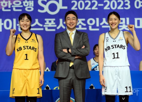 24일 서울 여의도 63컨벤션센터에서 열린 ‘신한은행 SOL 2022-2022 여자프로농구’ 미디어데이에서 KB스타즈 염윤아, 김완수 감독, 강이슬이 포즈를 취하고 있다.