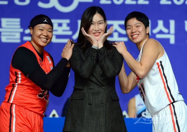 24일 서울 여의도 63컨벤션센터에서 열린 ‘신한은행 SOL 2022-2022 여자프로농구’ 미디어데이에서 BNK 썸 김한별, 박정은 감독, 진안이 포즈를 취하고 있다.