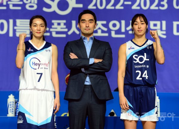 24일 서울 여의도 63컨벤션센터에서 열린 ‘신한은행 SOL 2022-2022 여자프로농구’ 미디어데이에서 신한은행 한채진, 구나단 감독, 김소니아가 포즈를 취하고 있다.