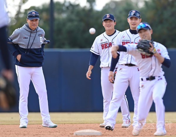 24일 이천 두산베어스파크에서 열린 두산 베어스의 마무리 캠프에서 두산 이승엽 감독과 박계범이 선수들의 훈련을 지켜보고 있다.