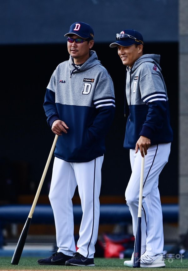 24일 이천 두산베어스파크에서 열린 두산 베어스의 마무리 캠프에서 두산 이승엽 감독과 김한수 코치가 이야기를 하고 있다.