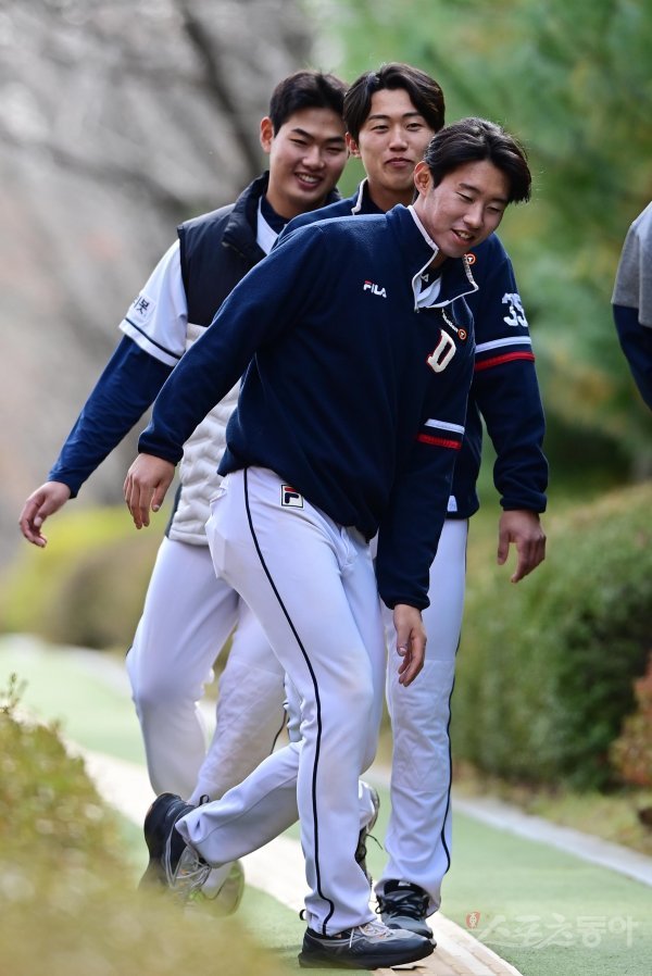 24일 이천 두산베어스파크에서 열린 두산 베어스의 마무리 캠프에서 두산 권민석, 전민재, 홍성호가 오전 훈련을 마친 후 장난을 치고 있다.