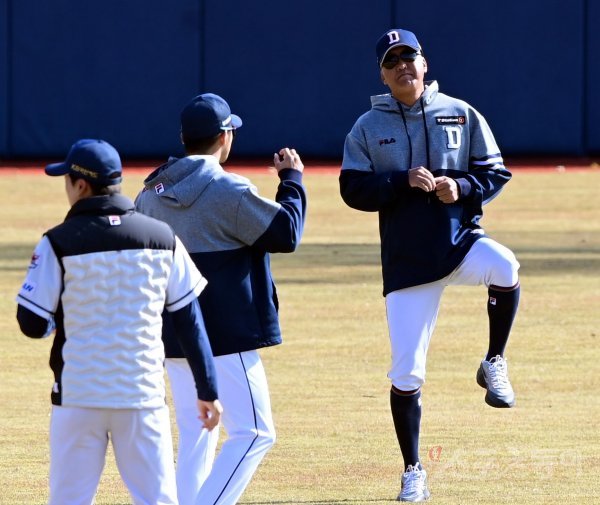 24일 이천 두산베어스파크에서 열린 두산 베어스의 마무리 캠프에서 두산 고토 코치가 선수들과 몸을 풀고 있다.