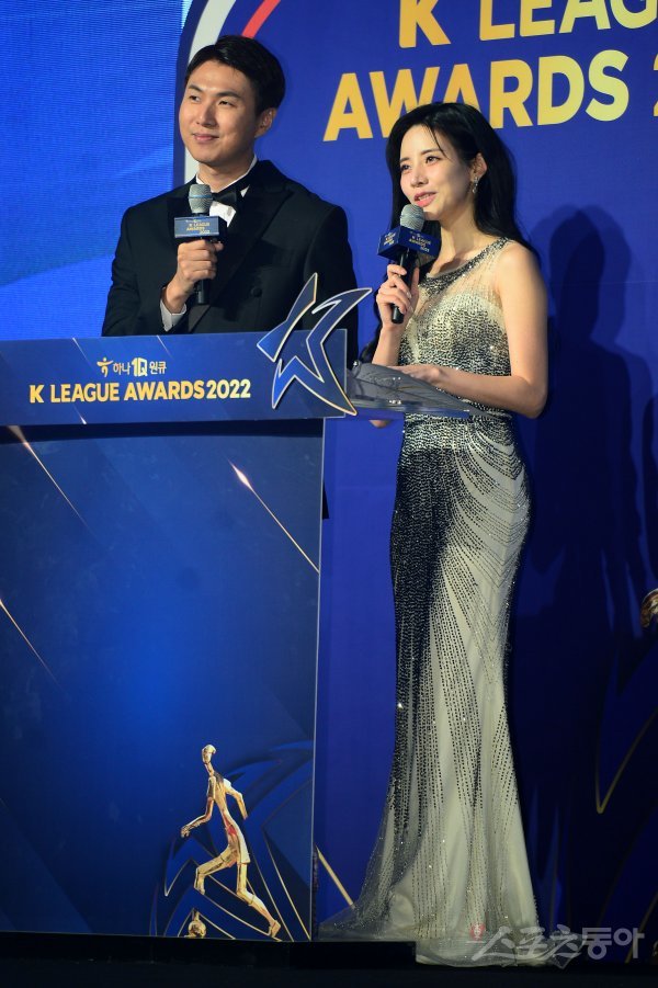 24일 서울 양재동 더 케이호텔에서 열린 ‘하나원큐 K리그 2022 대상 시상식’에 참석한 소준일, 장현정 아나운서가 사회를 맡아 행사를 진행하고 있다.