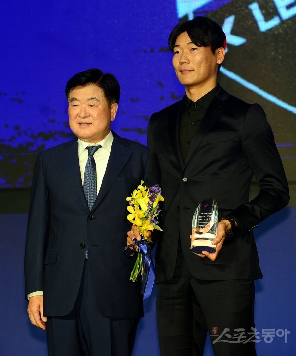 24일 서울 양재동 더 케이호텔에서 열린 ‘하나원큐 K리그 2022 대상 시상식’에서 K리그 2 베스트11 GK 부문을 수상한 광주 김경민이 한국프로축구연맹 권오갑 총재와 함께 기념촬영을 하고 있다.