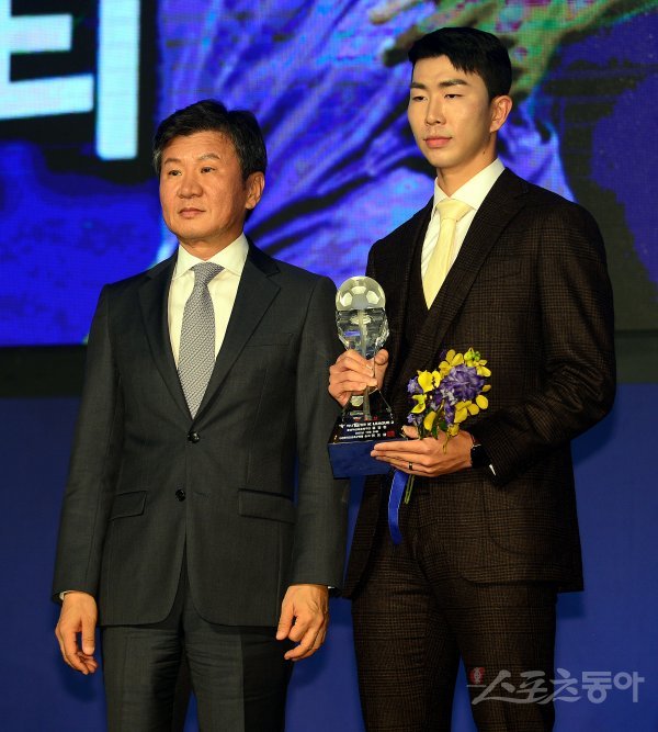 24일 서울 양재동 더 케이호텔에서 열린 ‘하나원큐 K리그 2022 대상 시상식’에서 K리그 2 최다득점상을 수상한 아산 유강현이 대한축구협회 정몽규 회장과 함께 기념촬영을 하고 있다.