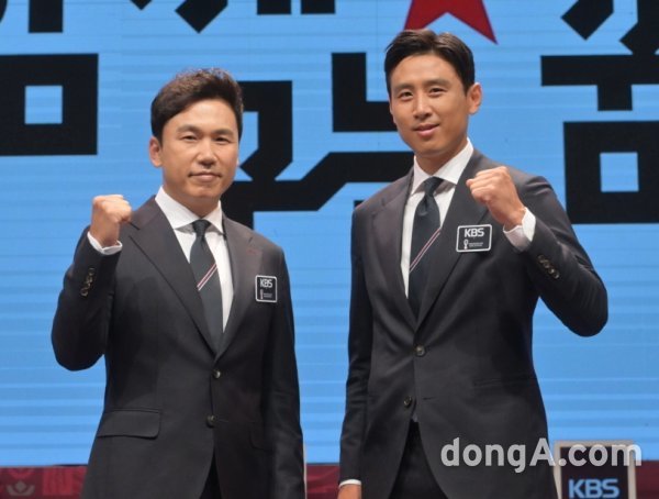 이광용 아나운서·구자철 선수가 24일 오전 온라인으로 진행된 KBS 2022 카타르 월드컵 중계진 제작발표회에서 포토타임에 임하고 있다.