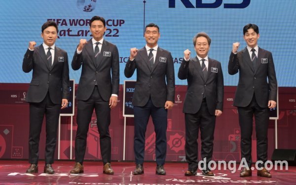 이광용 아나운서·구자철 선수·조원희 해설위원·한준희 해설위원·남현종 아나운서가 24일 오전 온라인으로 진행된 KBS 2022 카타르 월드컵 중계진 제작발표회에서 포토타임에 임하고 있다.
