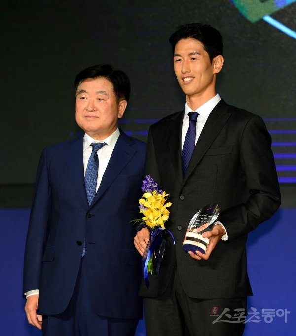 24일 서울 양재동 더 케이호텔에서 열린 ‘하나원큐 K리그 2022 대상 시상식’에서 K리그 2 MVP를 수상한 광주 안영규가 한국프로축구연맹 권오갑 총재와 함께 기념촬영을 하고 있다.