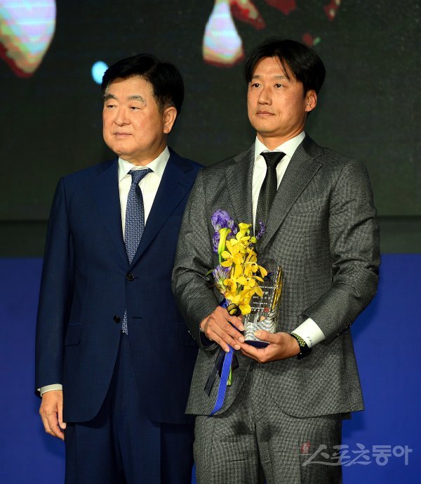 24일 서울 양재동 더 케이호텔에서 열린 ‘하나원큐 K리그 2022 대상 시상식’에서 K리그 2 감독상을 수상한 광주 이정효 감독이 한국프로축구연맹 권오갑 총재와 함께 기념촬영을 하고 있다.