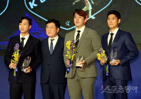 24일 서울 양재동 더 케이호텔에서 열린 ‘하나원큐 K리그 2022 대상 시상식’에서 K리그 2 베스트11 MF 부문을 수상한 광주 엄지성, 박한빈, 이순민이 한국프로축구연맹 권오갑 총재와 함께 기념촬영을 하고 있다.