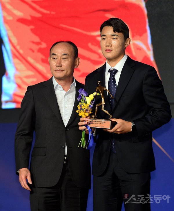 24일 서울 양재동 더 케이호텔에서 열린 ‘하나원큐 K리그 2022 대상 시상식’에서 K리그1 영플레이어상을 수상한 강원 양현준이 김학범 전 감독과 함께 기념촬영을 하고 있다.