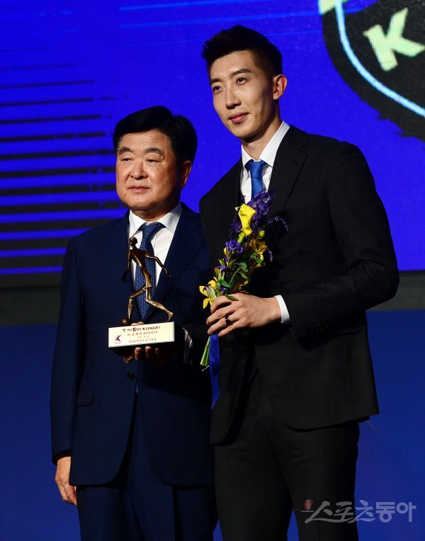 24일 서울 양재동 더 케이호텔에서 열린 ‘하나원큐 K리그 2022 대상 시상식’에서 K리그1 베스트11 GK 부문을 수상한 울산 조현우가 한국프로축구연맹 권오갑 총재와 함께 기념촬영을 하고 있다.