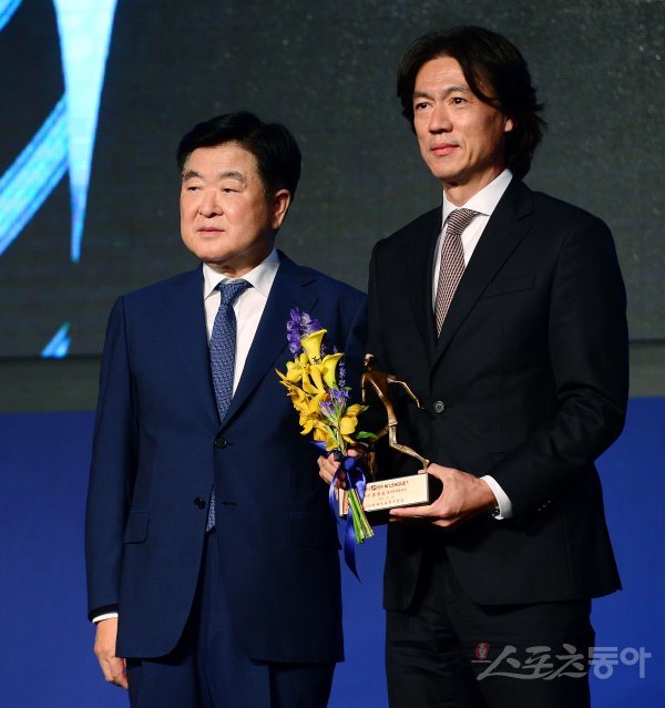 24일 서울 양재동 더 케이호텔에서 열린 ‘하나원큐 K리그 2022 대상 시상식’에서 K리그1 감독상을 수상한 울산 홍명보 감독이 한국프로축구연맹 권오갑 총재와 함께 기념촬영을 하고 있다.
