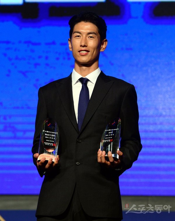 24일 서울 양재동 더 케이호텔에서 열린 ‘하나원큐 K리그 2022 대상 시상식’에서 K리그2 MVP를 수상한 광주 안영규 포즈를 취하고 있다.