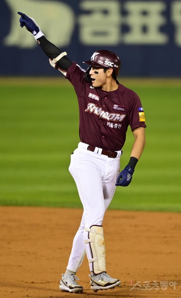 24일 서울 잠실야구장에서 열린 ‘2022 신한은행 SOL KBO리그’ 플레이오프 1차전 LG 트윈스와 키움 히어로즈의 경기에서 3회초 2사 1루 키움 이정후가 우전 2루타를 친 후 더그아웃을 향해 세리머니하고 있다.