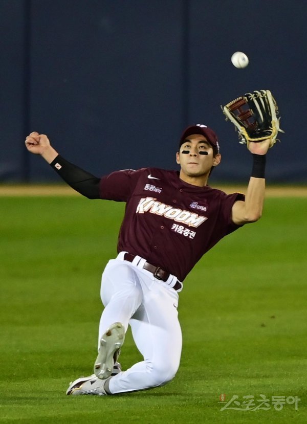 24일 서울 잠실야구장에서 열린 ‘2022 신한은행 SOL KBO리그’ 플레이오프 1차전 LG 트윈스와 키움 히어로즈의 경기에서 1회말 1사 1루 LG의 뜬공 때 키움 이정후가 볼을 잡고 있다.