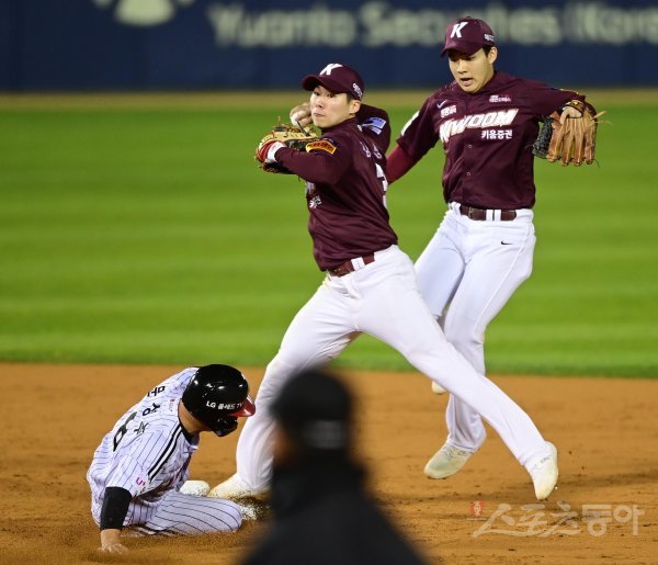 24일 서울 잠실야구장에서 열린 ‘2022 신한은행 SOL KBO리그’ 플레이오프 1차전 LG 트윈스와 키움 히어로즈의 경기에서 2회말 1사 1, 2루 LG의 내야 땅볼 때 키움 김혜성이 1루주자를 포스 아웃시킨 후 1루 송구하고 있다.