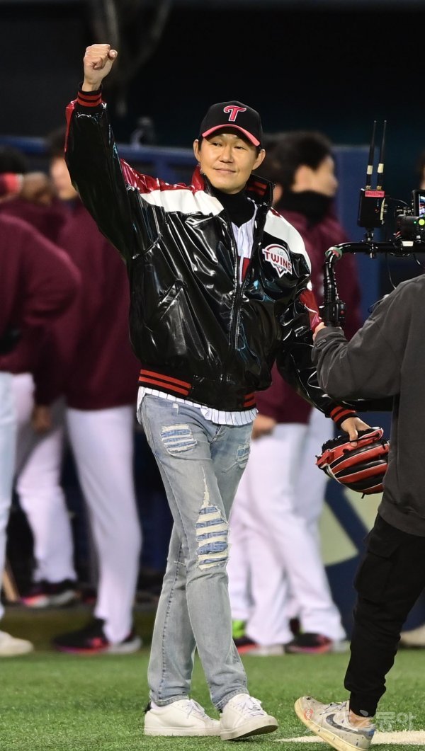 24일 서울 잠실야구장에서 열린 ‘2022 신한은행 SOL KBO리그’ 플레이오프 1차전 LG 트윈스와 키움 히어로즈의 경기에 앞서 배우 박성웅이 시구를 위해 마운드로 향하며 파이팅을 외치고 있다.