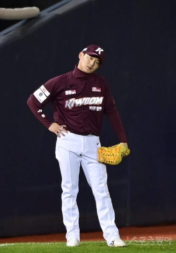 24일 서울 잠실야구장에서 열린 ‘2022 신한은행 SOL KBO리그’ 플레이오프 1차전 LG 트윈스와 키움 히어로즈의 경기에서 3회말 무사 1루 LG의 뜬공 때 키움 김준완이 늦은 송구로 1루주자를 진루시킨 후 아쉬워하고 있다.