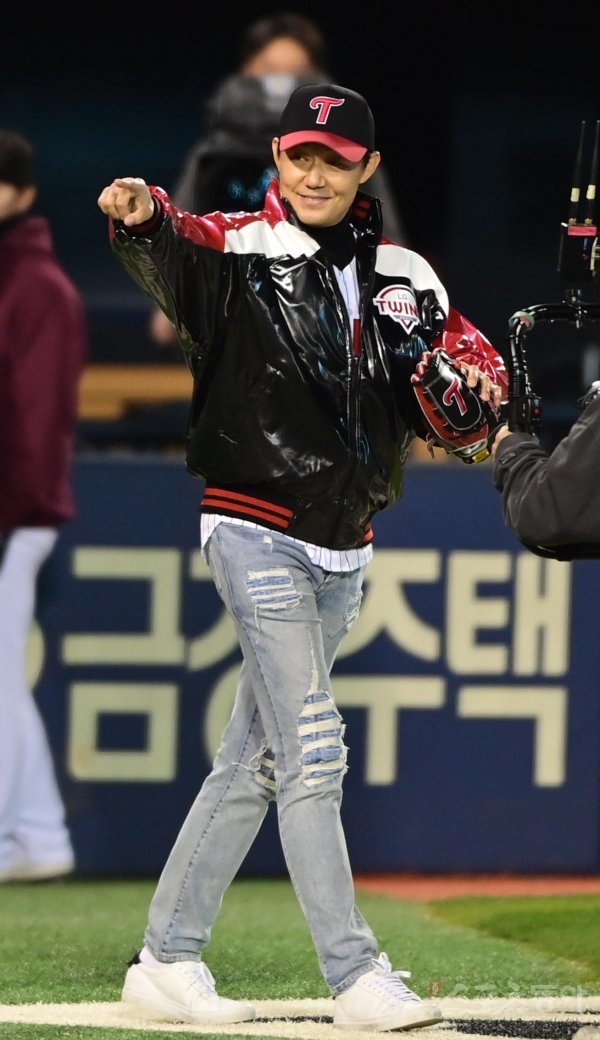 24일 서울 잠실야구장에서 열린 ‘2022 신한은행 SOL KBO리그’ 플레이오프 1차전 LG 트윈스와 키움 히어로즈의 경기에 앞서 배우 박성웅이 시구를 위해 마운드로 향하며 1루 더그아웃을 향해 손짓하고 있다.
