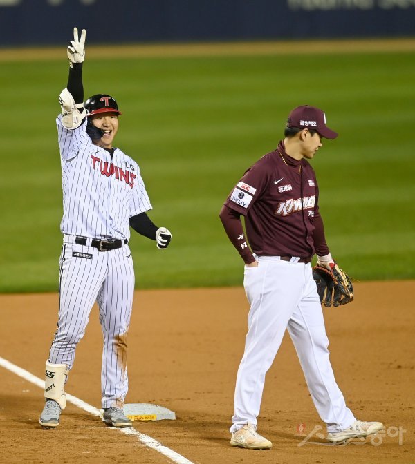 24일 서울 잠실야구장에서 ‘2022 신한은행 MY CAR KBO리그’ 플레이오프 1차전 키움 히어로즈와 LG 트윈스 경기가 열렸다. 3회말 2사 1, 3루 LG 문보경이 뜬공을 치고 키움 연속 실책하는 사이 3루까지 달려 세이프 된 후 기뻐하고 있다.