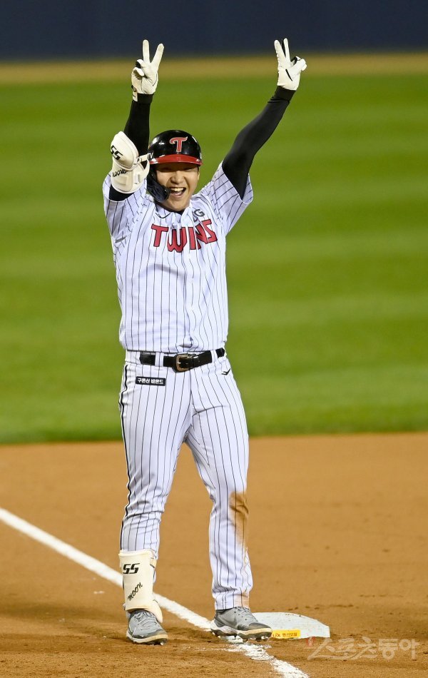 24일 서울 잠실야구장에서 ‘2022 신한은행 MY CAR KBO리그’ 플레이오프 1차전 키움 히어로즈와 LG 트윈스 경기가 열렸다. 3회말 2사 1, 3루 LG 문보경이 뜬공을 치고 키움 연속 실책하는 사이 3루까지 달려 세이프 된 후 기뻐하고 있다.