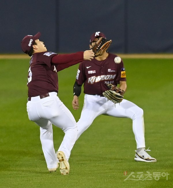24일 서울 잠실야구장에서 ‘2022 신한은행 MY CAR KBO리그’ 플레이오프 1차전 키움 히어로즈와 LG 트윈스 경기가 열렸다. 3회말 2사 1, 3루 LG 외야 뜬공 때 키움 김휘집이 포구 실책을 하고 있다.