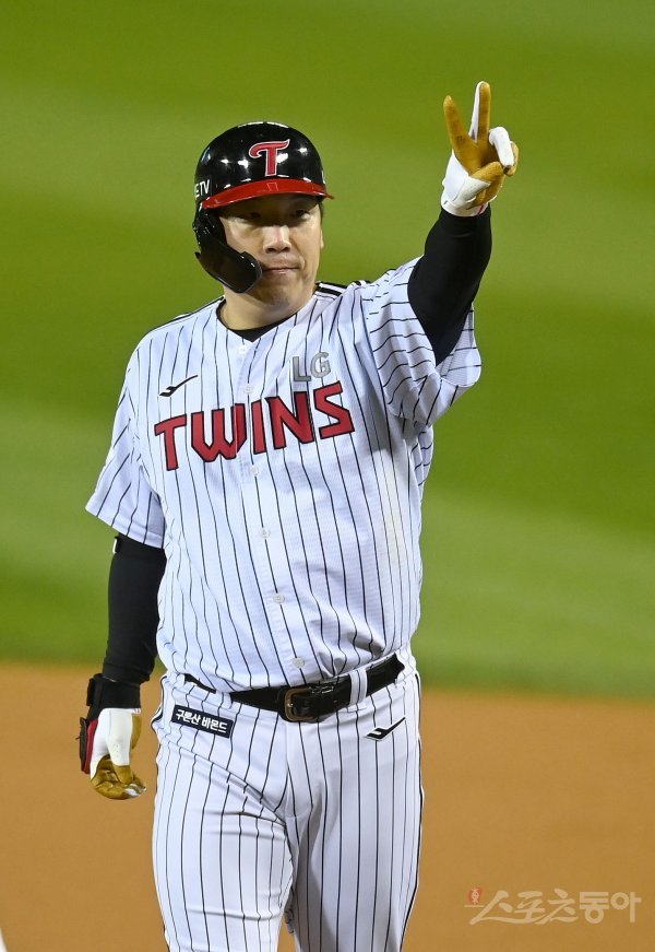 24일 서울 잠실야구장에서 ‘2022 신한은행 MY CAR KBO리그’ 플레이오프 1차전 키움 히어로즈와 LG 트윈스 경기가 열렸다. 3회말 1사 2루 LG 김현수가 1타점 우전 안타를 치고 1루에서 기뻐하고 있다.