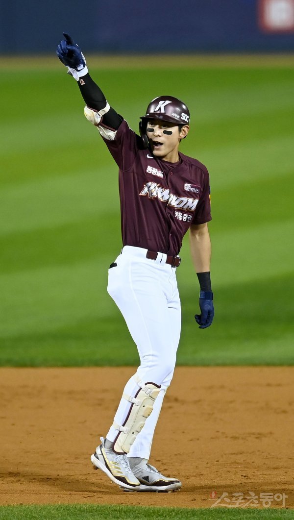 24일 서울 잠실야구장에서 ‘2022 신한은행 MY CAR KBO리그’ 플레이오프 1차전 키움 히어로즈와 LG 트윈스 경기가 열렸다. 3회초 2사 1루 키움 이정후가 중전 2루타를 치고 2루에서 기뻐하고 있다.