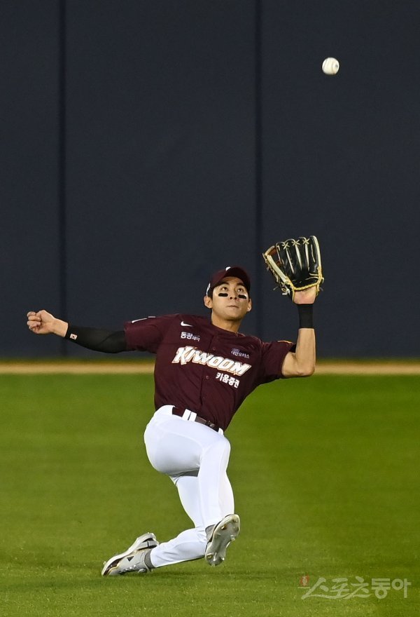 24일 서울 잠실야구장에서 ‘2022 신한은행 MY CAR KBO리그’ 플레이오프 1차전 키움 히어로즈와 LG 트윈스 경기가 열렸다. 1회말 1사 1루 키움 이정후가 외야 뜬공을 잡고 있다.