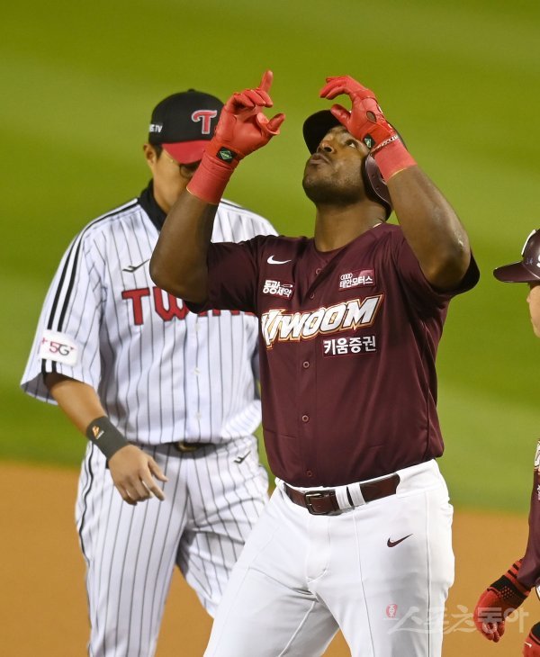 24일 서울 잠실야구장에서 ‘2022 신한은행 MY CAR KBO리그’ 플레이오프 1차전 키움 히어로즈와 LG 트윈스 경기가 열렸다. 2회초 1사 키움 푸이그가 좌전 안타를 치고 1루에서 기뻐하고 있다.