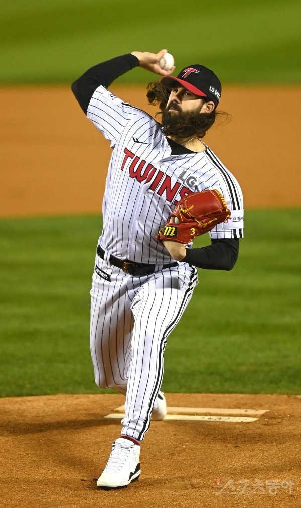 24일 서울 잠실야구장에서 ‘2022 신한은행 MY CAR KBO리그’ 플레이오프 1차전 키움 히어로즈와 LG 트윈스 경기가 열렸다. 선발 투수로 등판한 LG 켈리가 역투하고 있다.