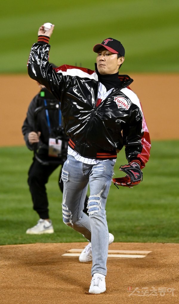 24일 서울 잠실야구장에서 ‘2022 신한은행 MY CAR KBO리그’ 플레이오프 1차전 키움 히어로즈와 LG 트윈스 경기가 열렸다. 베우 박성웅이 시구를 하고 있다.