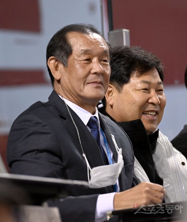 24일 서울 잠실야구장에서 ‘2022 신한은행 MY CAR KBO리그’ 플레이오프 1차전 키움 히어로즈와 LG 트윈스 경기가 열렸다. 야구인 박철순과 이만수가 관전을 하고 있다.