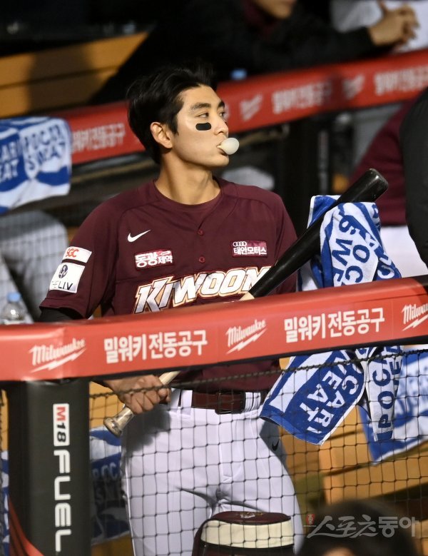 24일 서울 잠실야구장에서 ‘2022 신한은행 MY CAR KBO리그’ 플레이오프 1차전 키움 히어로즈와 LG 트윈스 경기가 열렸다. 경기 전 키움 이정후가 배트를 닦고 있다.