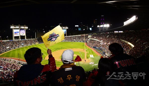 24일 서울 잠실야구장에서 열린 ‘2022 신한은행 SOL KBO리그’ 플레이오프 1차전 LG 트윈스와 키움 히어로즈의 경기에서 만원 관중들이 응원을 펼치고 있다.